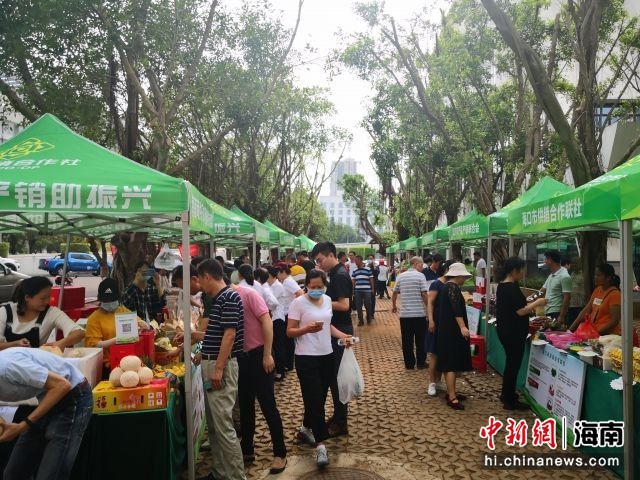 中新網海南新聞4月29日電(符宇群) 4月28日下午,海南省供銷社聯合海南省扶貧辦、海南愛心扶貧網等單位在海南省委海南廣場辦公區舉辦“消費助農大集市”活動?;顒訄鲈O21個攤位,來自12個市縣供銷社和幫扶機制企業帶來肉禽蛋類、海產干貨、瓜果蔬菜等100多款助農產品,現場銷售額近10萬元。