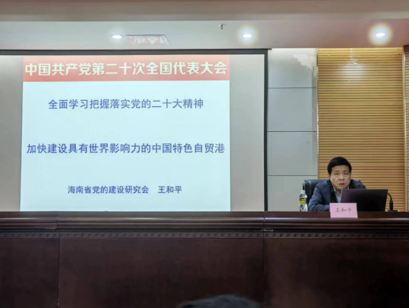 王和平以《全面學(xué)習(xí)把握落實(shí)黨的二十大精神 加快建設(shè)具有世界影響力的中國(guó)特色自由貿(mào)易港》為題,從全面學(xué)習(xí)把握一個(gè)大會(huì)主題、新時(shí)代十年偉大變革根本原因在于“兩個(gè)確立”、新時(shí)代經(jīng)歷的三件大事、中國(guó)特色社會(huì)主義“四個(gè)自信”、中國(guó)式現(xiàn)代化“五個(gè)特色”、習(xí)近平新時(shí)代中國(guó)特色社會(huì)主義思想世界觀和方法論的“六個(gè)堅(jiān)持”、深入推進(jìn)新時(shí)代黨的建設(shè)新的偉大工程“七大任務(wù)”等7個(gè)方面,向與會(huì)人員全面解讀和深入闡釋了黨的二十大精神,報(bào)告語言生動(dòng)、案例精彩、數(shù)據(jù)翔實(shí),使與會(huì)人員進(jìn)一步加深了對(duì)黨的二十大精神的理解。