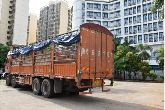 運送香蕉的大卡車抵達海口市第四人民醫院總院