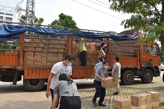 2022年9月7日,儋州的待銷香蕉提前一天裝箱打包好,一早從儋州送往海口的抗疫機構,上午9點運送香蕉和物資的大卡車抵達海口市第四人民醫院總院門前,為盡快將捐贈物資運送到抗疫一線工作者手里,省供銷集團全力調度下屬企業運輸車輛,同時組織公司9名員工前往現場將大卡車香蕉卸貨分裝到小車里運往其他捐贈點,在炎熱的太陽下卸貨,公司員工身上衣服都濕透了,仍齊心協力繼續堅持將大卡車上的1000多箱香蕉全部卸完,順利將捐贈物資交接給海口市紅十字會工作人員,隨后將捐贈物資送往省中醫院、市委黨校和美安實驗室等抗疫機構,及時分發捐贈物資到抗疫一線工作者手里。