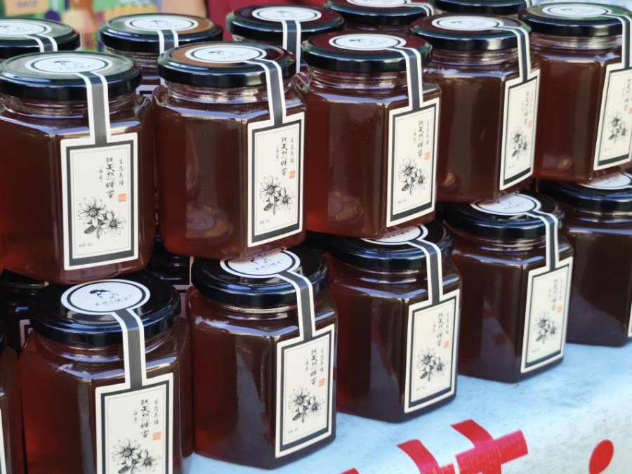 “來嘗一嘗本地黑豬肉干!”“這里有本地野生蜂蜜看一看!”……