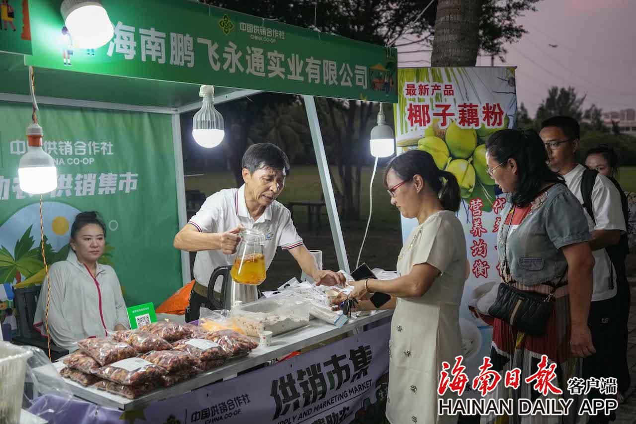 8月31日晚,由海南省供銷合作聯社牽頭,聯合各市縣供銷系統單位在海口萬綠園共同舉辦常態化消費助農·供銷市集活動。現場農戶賣力銷售,群眾爭相選購,場面熱鬧。