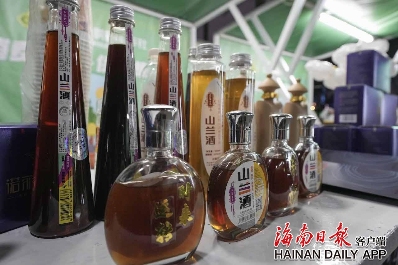 8月31日晚,在海口市萬綠園共同舉辦常態化消費助農·供銷市集活動現場,幫扶產品銷售攤位上擺放的山蘭酒。海南日報記者 王程龍 攝