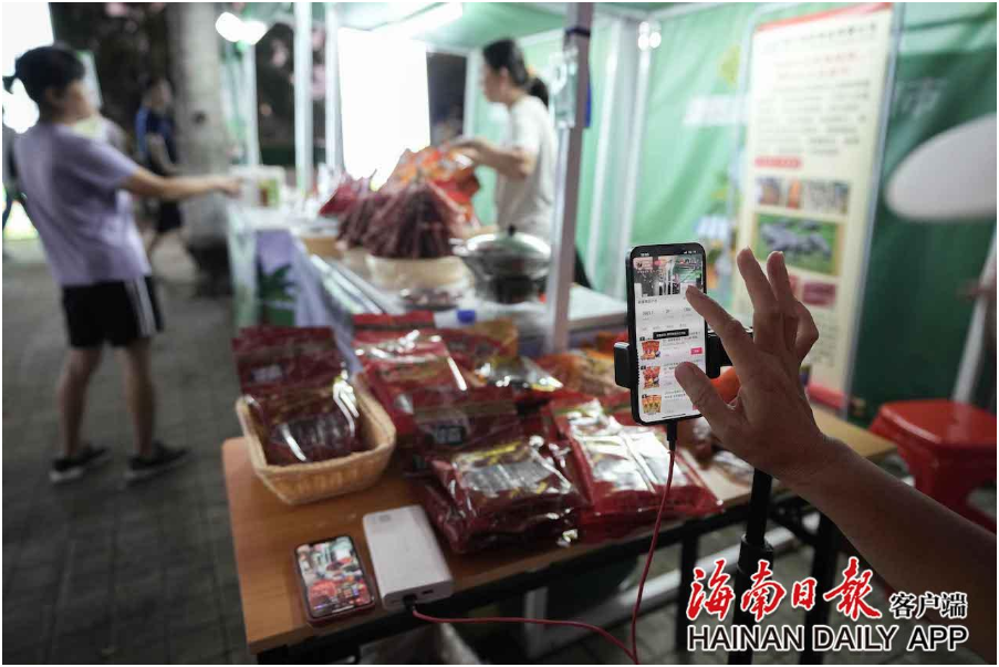 8月31日晚,在海口市萬綠園共同舉辦常態化消費助農·供銷市集活動現場,幫扶產品銷售攤位上的工作人員,正在直播帶貨。海南日報記者 王程龍 攝