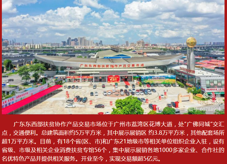 廣東東西部扶貧協作產品交易市場位于廣州市荔灣區花博大道,處“廣佛同城”交匯點,交通便利。總建筑面積約5萬平方米,其中展示展銷區約3.8萬平方米,其他配套場所超1萬平方米。目前,有18個省(區、市)和廣東21地級市等相關單位組織企業入駐,設有省級、市級及相關企業消費扶貧專館56個,集中展示展銷各地1000多家企業、合作社的名優特色產品并提供相關服務。開業至今,實現交易額超5億元。