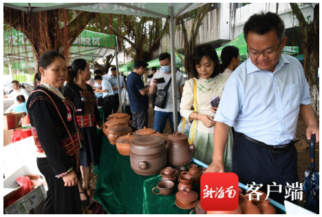 集市一開市,來自昌江的黎陶就吸引了大家的注意。昌江供銷社的攤位上,保突黎陶制品專業(yè)合作社燒制的黎陶一字排開,不同用途的陶器上雕刻著黎族特有的花紋。黃玉英是保突制陶專業(yè)合作社的負(fù)責(zé)人,也是黎族原始制陶技藝縣級代表性傳承人,她制陶已有30多年。在母親的教導(dǎo)下,黃玉英也成了一名手藝人,并在2013年和同村婦女一起成立了保突黎陶制品專業(yè)合作社,通過“合作社+貧困戶”的模式,帶動20個社員增收,帶領(lǐng)村民共同致富,古老的黎陶重新煥發(fā)出活力。