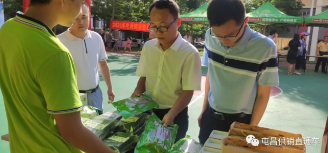 (屯昌縣委常委、組織部部長吳能現場帶頭購買貧困戶農產品)