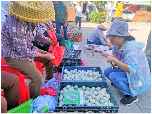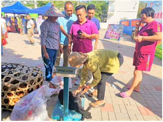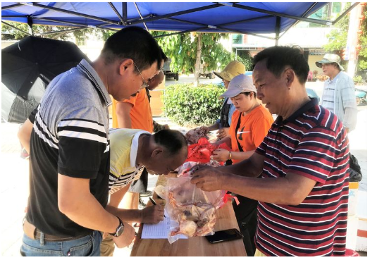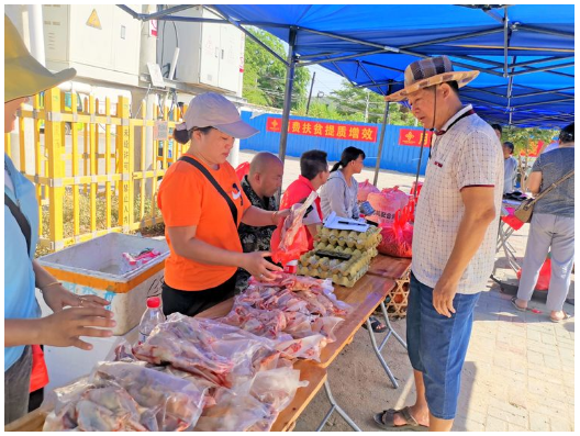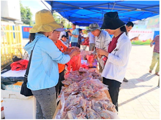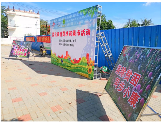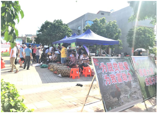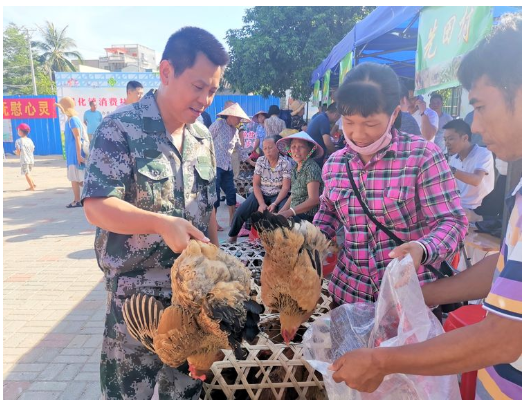 集市現場為扶貧企業和各行政村設立了指定攤點,分別展示了扶貧企業昌江田園養鴿專業合作社和各村貧困戶的乳鴿、瓜果蔬菜、家禽、花生油等農副產品,每個攤點還有昌化鎮政府干部、縣供銷社干部和新時代文明實踐站志愿者為貧困戶做消費宣傳、登記和服務,確保貧困戶的農副產品有序出售。