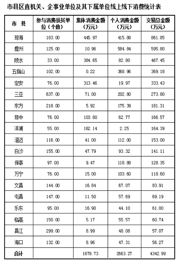 (二)1-5月省直機關、企事業單位及其下屬單位線上線下集體消費1153.79萬元、個人消費798.50萬元,合計1952.29萬元;市縣直屬單位集體消費金額1679.73萬元、個人消費金額2663.27萬元,合計4342.99萬元。三亞、瓊海、屯昌、白沙等市縣通過其它電商渠道消費108.74萬元。