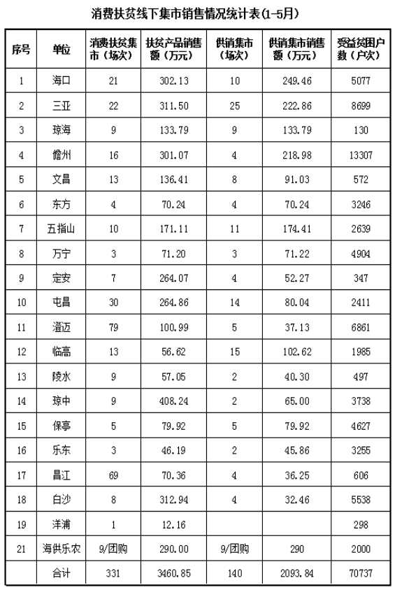 (四)1-5月,海南愛心扶貧網完成銷售額996.91萬元(線上銷售416.62萬元,線下銷售580.29萬元),在售商品905個,累計注冊28.76萬人;4個市縣單位抖音直播銷售總額694萬元。愛心扶貧網開展的戰役助農社區團購,共推出扶貧產品22款,銷售金額170.47萬元。三亞、瓊海、屯昌、白沙等市縣通過其它電商渠道銷售198.66萬元。